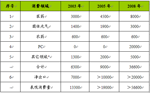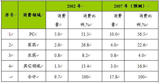 综上,2002年及2007年(预测)世界DMC的消费结构见下表:
