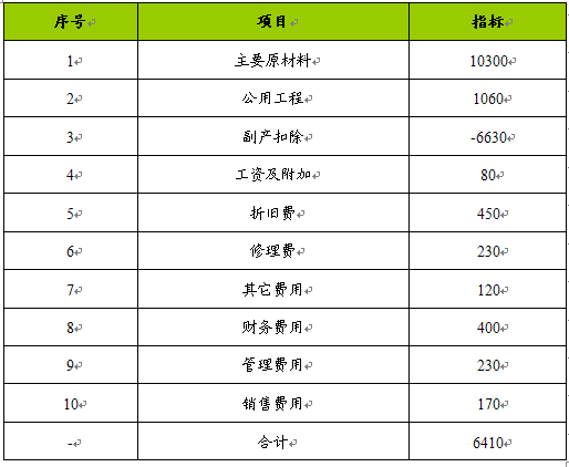 激烈的市场竞争使得碳酸二甲酯产品的市场价格一降再降,从长远来看将维持在7000-8000元/吨这样的水平上。以1万吨/年酯交换法碳酸二甲酯生产装置为测算基础。本文对其产品的生产成本进行粗估。其中建设投资估算5800万元,产品及原材料按市场价格取价,公用工程价格按照国内中等水平取价,其静态投资生产成本测算结果如下表所示: