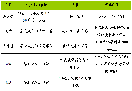 麦当劳以年轻人为主要目标市场(年龄由4岁~30岁男、女性),比萨与肯德基则以家庭成员的消费客层为主要诉求对象。