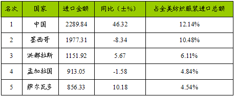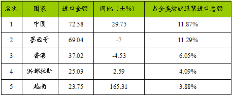 据美国海关统计,美国从中国进口纺织品服装数量相当于82.86亿平方米,比上年同期增长66.97%;总额达到116.08亿美元,同比上涨了32.76%,占全美纺织服装进口总额的19.6%,进口总额排名第一位,成为美国第一大供应国。