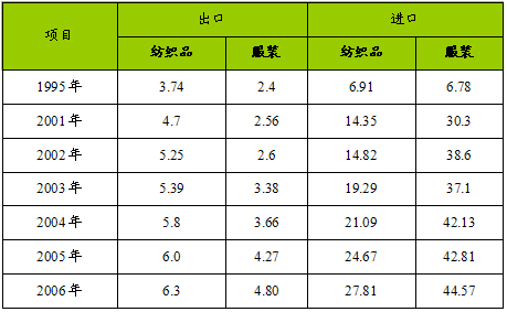 日本向中国的出口。除了缝制服装后送回日本的面料外,从日本出口到中国的最主要产品是腈纶短纤维。日本生产的腈纶短纤维中有超过50%向中国出口。日本从中国的进口。日本已是我国最大的纺织成衣市场,日本国内市场有30.4亿件服装(外衣+内衣)的供应,其中从中国进口的有26.7亿件。按比例可以说日本服装零售商销售的5件服装中有4件是中国制作的。
