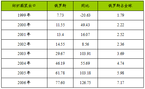俄罗斯市场对纺织品的需求很大,每年消费各类纺织品约170亿美元,服装消费大约360亿美元。据俄罗斯官方统计,俄服装市场每年消费棉布48亿平方米,丝绸9亿平方米,袜子6亿双,鞋类6.5亿双;还需要大量服装及枕巾.浴巾、床上用品等家用纺织品。俄罗斯对纺织服装的消费,除了依靠超级市场、百货商店、服装专卖店之外,各种面料、辅料、服装的批发市场是俄罗斯经销商和普通消费者的重要消费场所。