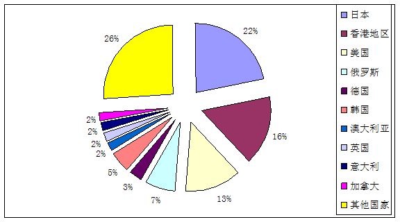 日本是我服装出口第一大市场,尽管近两年日本经济复苏的步伐迟缓,我对日出口增幅低于美欧,为11.89%,使我国服装出口增幅最小的目的国,但出口额达124.88亿美元,占我服装出口总额的24.46%,比居第二位的中国香港高近8个百分点。