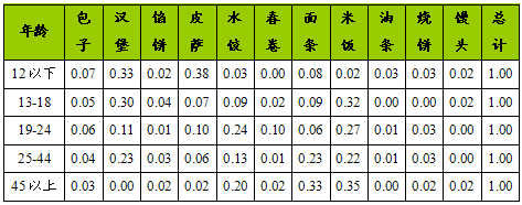 (2)分年龄段来看,儿童和少年对西式快餐的汉堡包和比萨饼非常感兴趣,而对绝大多数中式快餐产品(包子除外)几乎不感兴趣,特别是12岁以下儿童;45岁以上中老年消费者对中式快餐产品非常感兴趣,特别是对水饺的偏好。
