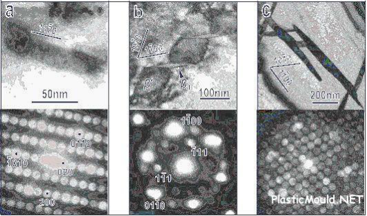花样显示了β’,β1,和β析出相的形态与晶体特徵。入射束分别平行于[0001]α和[001]β’(a),[110]β1(b),以及[110]β(c)。
