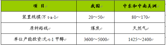 国内甲醇装置规模仍然较小,且多采用煤头路线,单位产能投资高,约为国外大型甲醇装置投资的2倍,财务费用和折旧费用提高,影响成本竞争力。而以中东和中南美洲为代表的国外甲醇装置普遍规模大,公用设施分摊投资少,且采用天然气路线,单位产能投资大幅下降,成本竞争力大为增强。