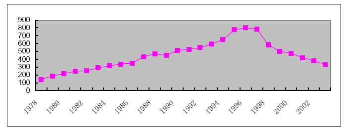 1978-2003中国白酒产量曲线图