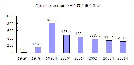 1949年的新中国成立时,我国白酒的产量只有10.8万吨,到了“文革”以后的1978年,我国白酒产量达到143.74万吨,比建国初期增长了近15倍;改革开放以后,我国开始由计划经济向社会主义市场经济转变。八十年代起,白酒的产量增长步伐加快,到1996年,即“九五”初期,我国白酒产量达到历史高峰,总量达到801.30万吨,是建国初期的80倍左右。“九五”以来,为适应国民经济建设的总体要求,并提高白酒 行业 的投入产出比和综合经济效益,国家对白酒 行业 制定了以调控和调整为基础的 产业政策 。此后几年,国家宏观政策的调控逐步凸现成效, 产业政策 的调整也现成果,白酒的产量逐步下降。