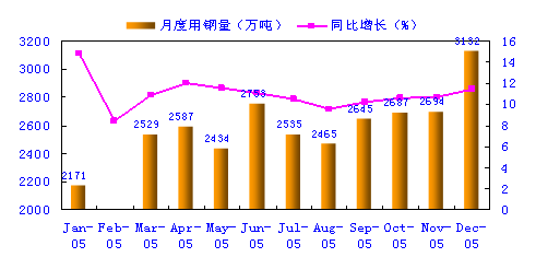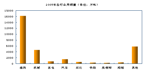 各主要用钢 行业 景气回落是05年全年钢材需求增速放缓的主要原因。建筑 行业 全年的钢材需求约为1.62亿吨,增幅较去年回落0.61个百分点。而另一个用钢大户-----机械 行业 运行态势良好,1-8月份机械 行业 的钢材需求同比增加了15.54%,预计全年将增加15.38%,但相比04年同期,增幅降低了4.42个百分点。家电 行业 、石油天然气 行业 、铁路等 行业 受宏观调控的影响,增幅较去年都有所回落,影响了 行业 用钢(板材、管材、铁路用钢)需求的增加;集装箱 行业 则受到全球航运市场降温的冲击,增幅放缓,景气回落。而汽车 行业 在经过了9个月的阴霾后,显示出复苏迹象,3-5月销售增长,下半年车市有望回暖,实现平稳增长。此外,船舶工业继续保持高增长,拉动了板材特别是船板的需求。