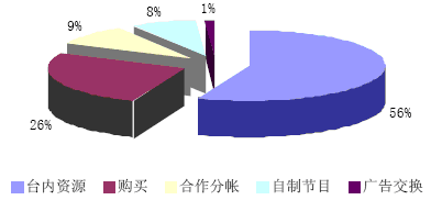 根据广电在线的调查显示,在目前数字电视频道的节目获取方式中,电视台内部资源占主要部分,另有约1/4采用购买,合作分帐方式约1/10,广告部分仅有1%,与传统电视有着巨大差异。