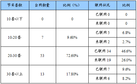 我国地市级以上城市有线电视网络开通的节目20-30套的网络占多数(72.6%),有待通过数字电视提高。已有63%的网络与省台或地市合实现了联网,其中开通20-30套节目的网络占绝对多数,表明随着节目套数的增多,有线电视网络的联网重要性加强。