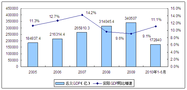 由上图可知,近年来我国国内生产总值(GDP)一直保持高速增长,增长幅度均超过了9%。虽然受世界性经济危机的影响,我国2008和2009年的GDP增长幅度有所下降,但2010年的前2个季度的经济增长幅度出现回升。