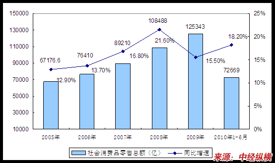 市场销售较快增长,热点商品持续旺销。2010年上半年,社会消费品零售总额72669亿元,同比增长18.2%。按经营单位所在地分,城镇消费品零售额62659亿元,增长18.6%;乡村消费品零售额10010亿元,增长15.6%。按消费形态分,餐饮收入8181亿元,增长16.9%;商品零售64488亿元,增长18.4%。其中,限额以上企业(单位)商品零售额26465亿元,增长30.0%。热点消费快速增长。其中,汽车类增长37.1%,家具类增长38.5%,家用电器和音像器材类增长28.8%。