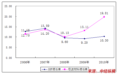2006-2010年复合型吸波材料与GDP增长走势对比图