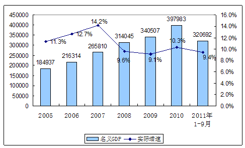 2005年-2011年前三季度我国GDP增长变化图 单位:亿元