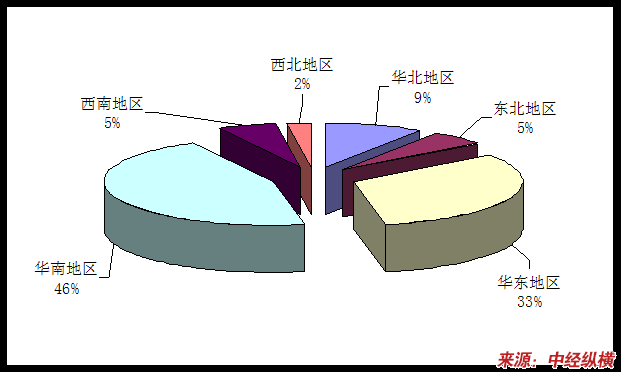 由图中比例可看出我国塑料制品 行业 东西部差距大、区域发展不平衡。其中华南地区占据总体生产能力的45.5%位居第一,其次的华东地区以32.2%的比例位居第二。而西北和西南地区发展严重落后于华南和华东地区。