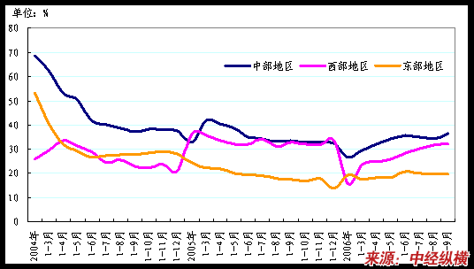 由于东部经济发达地区土地资源偏紧、价格高和房地产市场竞争激烈,使得一些房地产开发商纷纷从竞争激烈的东部城市转向中西部二线城市开发投资,看准中西部巨大的房地产消费市场。2006年1-9月,东部地区完成投资8297.8亿元,同比增长19.5%,增速低于全国平均水平4.8个百分点;中部地区完成投资2286.0亿元,同比增长36.3%,超过全国水平12个百分点;西部地区完成投资2318.6,同比增长32.1%,超过全国水平7.8个百分点。从各地区的房地产投资增长情况看,1-9月份全国31个省(区、市)中有17个省(区、市)的房地产开发投资增长速度超过全国平均水平,增长居前的地区是福建、吉林、河南、内蒙古、西藏五个省份,同比增长幅度都在40%以上,其中,内蒙古、西藏增速最为强劲,同比增长分别为104.9%和73.0%。以上数据表明,抑制房地产开发投资的过快增长依然是宏观调控的当务之急。