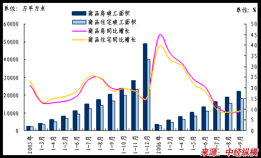 截至2006年9月底,全国商品房空置面积为1.21亿平方米,同比增长11.7%。其中,空置商品住宅6591万平方米,同比增长9.7%,这一数字仍然维持居高不下的状态。空置面积没有大改观的原因主要是市场上需求与供给的不匹配造成的,开发商开发产品与消费者需要的户型不一致。虽然近期房地产各项宏观调控政策都强调要调整住房供应结构,加大普通商品房及经济适用房的投资规模,但房型投入市场需要一年到一年半的周期,考虑到当前已建户型是去年的开工项目,因此本轮调控的效果在空置率上可能明年才会显现。