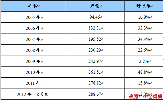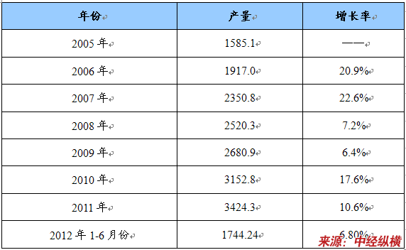 2005-2012年铝合金制造 行业 产量增长情况统计表 单位:万吨