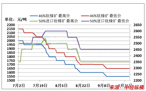 自8月初钛精矿价格延续7月下旬跌势之后,直至8月中旬价格才渐渐趋稳,进入9月份,国内46%钛精矿市场月初小幅下行50元之后,行情趋稳,但成交量不高,市场淡稳运行。进口钛精矿市场在整个9月份维系低稳运行态势,价格无变动,但市场成交清淡,市场交投欠佳。