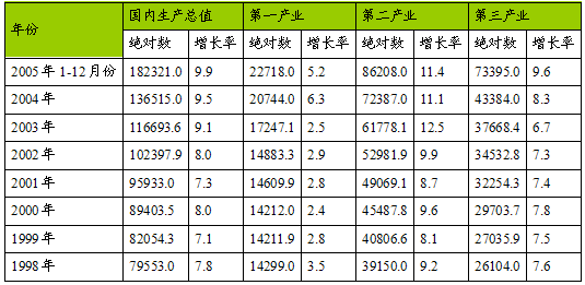1998-2005年1-12月份中国国内生产总值(按三次产业分)数据汇编