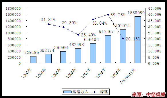 2003-2010年1-11月石榴子石 行业 销售收入发展状况