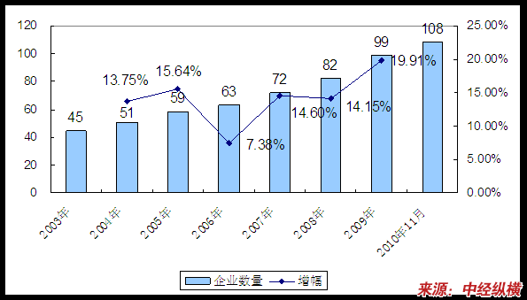 2003-2010年1-11月石榴子石 行业 企业数量发展状况