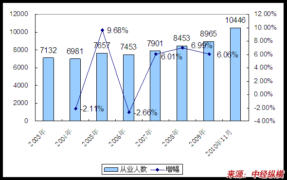 2003-2010年1-11月石榴子石 行业 从业人员发展状况