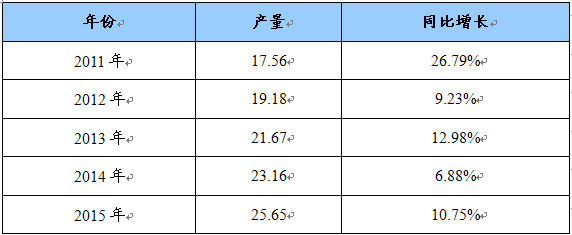 2011-2015年中国复合型吸波材料产量及同比增长 单位:万吨