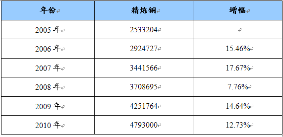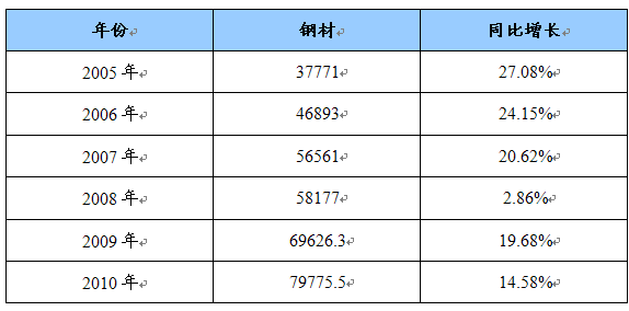 汽车空调涡旋压缩机主要原材料(钢材)产量增长统计表 单位:万吨