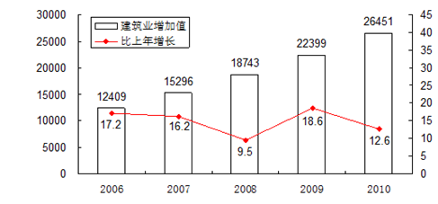 2010年全年全社会建筑业增加值26451亿元,比上年增长12.6%。全国具有资质等级的总承包和专业承包建筑业企业实现利润3422亿元,增长25.9%,其中国有及国有控股企业990亿元,增长35.0%。