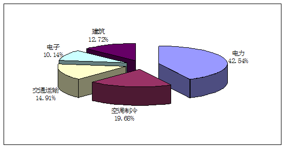 2)电力消费。2010年全社会用电量41923亿千瓦时,其中,第一产业984亿千瓦时,比重为2.3%;第二产业31318亿千瓦时,比重为74.7%,比上年提高0.6个百分点;第三产业4497亿千瓦时,比重为10.7%;城乡居民生活5125亿千瓦时,比重为12.2%。分地区看,用电量排在前五位的省份依次是广东(4060亿千瓦时)、江苏(3856亿千瓦时)、山东(3300亿千瓦时)、浙江(2825亿千瓦时)、河北(2692亿千瓦时)。