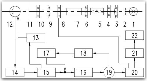 注:1、钠灯;2、聚光镜;3、场镜;4、起偏器;5、调制器;6、准直镜;7、试管;8、检偏器;9、物镜;10、滤色片;11、光栏;12、光电倍增管;13、自动高压;14、前置放大;15、选频放大;16、功率放大;17、非线性控制;18、测速反馈;19、伺服电机;20、机械传动;21、模数转换;22、数字显示。