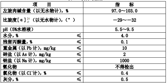 本标准规定了食品添加剂左旋肉碱的要求、试验方法、检验规则、标志、包装、运输和贮存要求。