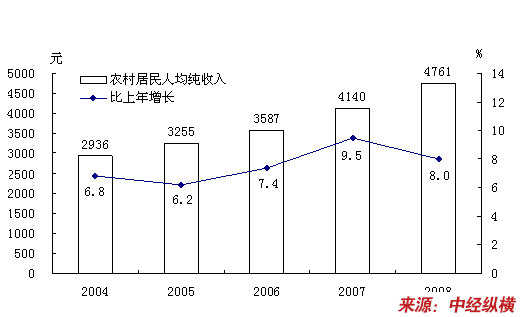 全年农村居民人均纯收入4761元,扣除价格上涨因素,比上年实际增长8.0%;城镇居民人均可支配收入15781元,实际增长8.4%。农村居民家庭食品消费支出占家庭消费总支出的比重为43.7%,城镇居民家庭为37.9%。按2008年农村贫困标准1196元测算,年末农村贫困人口为4007万人。