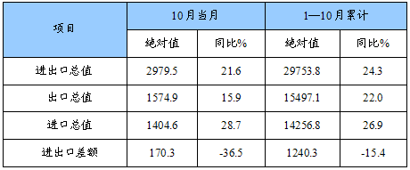 2011年1-10月,全国进出口总值为29753.8亿美元,同比增长24.3%,其中:出口15497.1亿美元,增长22.0%;进口14256.8亿美元,增长26.9%。10月当月,全国进出口总值为2979.5亿美元,同比增长21.6%,其中:出口1574.9亿美元,增长15.9%;进口1404.6亿美元,增长28.7%。