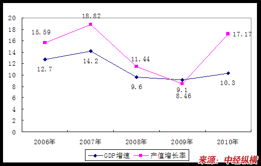 2005-2010年高压薄膜电容器产值与GDP增速对比图