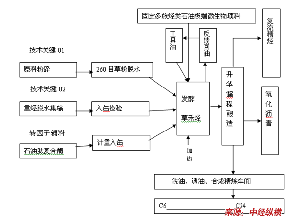 上述有机主料脱水加入PCR-石油肽、石油酶催化作用,重烃解离酶转因子发酵草粉合成核心技术原料“草禾烃”它是生产轻质燃油的技术关键。重烃:即沉积重质渣油、煤焦油、废沥青、稠油(油田洗缶油)、化工厂清污油、部分废橡胶、旧车胎粉末等。柴油出率60-70%。生物肽重烃复合酶转因子技术系列利用草禾烃发酵过程中受热诱发“禾能”变化,得到烷基化过渡吸收改性,在生物化合耗热过程中整个烃合成“代谢”化合在混溶发酵的液相中生成轻质燃油及副产品石油炭粉。