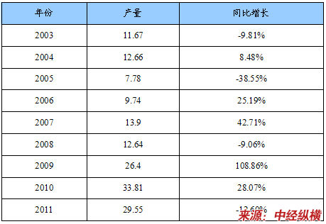 2003-2011年中国自卸车前顶举升油缸产量及同比增长