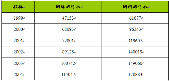 截至2005年底统计,全国有国际旅行社1590家,国内旅行社15256家,总计16846家。其中:有15601家通过年检,占总数的92.61%;有809家暂缓通过年检,分别受到限期改正、警告、通报批评、限期整顿、停业整顿等处分,占总数的4.80%;有436家不予通过年检,占总数的2.59%。