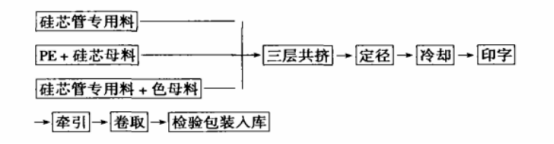 硅芯管是以HDPE树脂为主要原料,芯层为硅胶与HDPE树脂共混改性,由三台塑料挤出机共挤,经真空定型、冷却、牵引、卷取等工序而成,其工艺流程为: