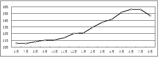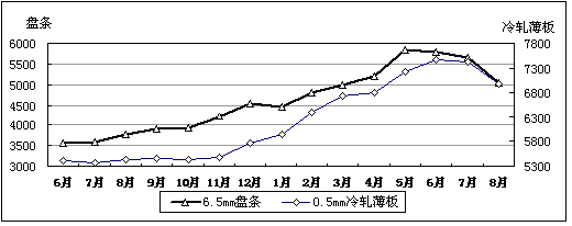 2008年8月份,全国粗钢产量同比仅增长1.3%,增速比上月减缓6.2个百分点;钢材产量下降0.2%。钢材出口768万吨,比上月增加47万吨;进口133万吨,比上月减少11万吨。钢材价格明显回落。月末,国内市场钢材价格综合指数152.22点,比上月末回落8.77点,比年初上涨27.1点,同比上涨39.29点。6.5mm盘条、10mm中板、0.5mm冷轧薄板平均价分别为5031元/吨、6313元/吨和6992元/吨,比上月末回落621元/吨、385元/吨和439元/吨,降幅为11%、5.7%和5.9%,同比上涨33.1%、36%和28.9%。