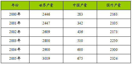 2000—2005年世界电解铝产量表