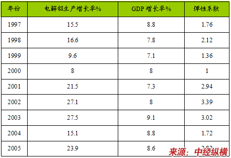 1997~2005年GDP、原铝消费增长率以及原铝消费弹性系数