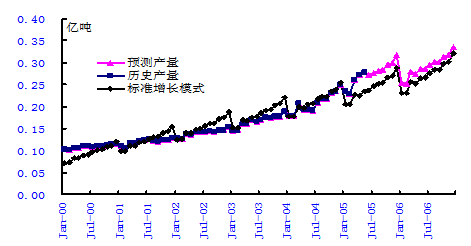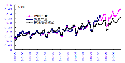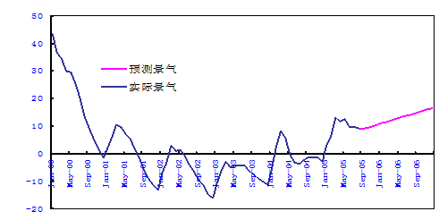 各主要产品的产出景气从04年8月起开始反弹,强劲的上升势头持续到04年年底。今年上半年,随着新增和已有产能的快速释放,景气仍保持高位。受钢材市场价格大幅波动的影响,近期厂家库存处于高位,为了消化已有库存并保持钢材价格的稳定,预计第四季度各钢铁企业仍将在一定程度限产,钢材生产景气也将从高位逐渐回落。预测结果表明,2005年第四季度及全年成品钢材产量将分别达到10667.84万吨和37691.59万吨,同比增幅为29.64%和27.69%。