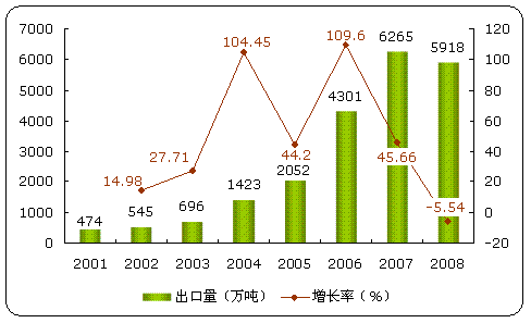 在世界经济不景气的宏观环境下,发达国家经济出现整体衰退,发展中国家经济减速,对钢材需求均出现下降。同时钢铁领域的贸易保护主义愈演愈烈,这些都成为阻碍我国钢材出口的重要因素。下图为2001-2008年我国钢材出口量及其增长率。从下图中可以看出我国钢材出口在连续6年正增长之后,在2008年首次出现负增长。