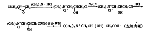 工业上常采用以还氧氯丙烷为起始原料的化学合成法,可在反应的不同步骤中进行化学拆分或反应前加人手性试剂进行不对称诱导得到左旋肉碱。该法简便,原料廉价,收率较好,但必须解决NaCN等造成的污染。