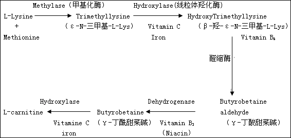 (2)生物合成法严格限制在肝、肾组织,还需烟酸、维生素C、维生素B6、Fe2+的参与,其中维生素C对肉碱的合成速度影响最大。合成一分子赖氨酸和三分子蛋氨酸,赖氨酸提供碳链和氮原子,蛋氨酸提供甲型。肌肉组织中肉碱含量虽然高,但要依赖来自肝、肾的血液输送。