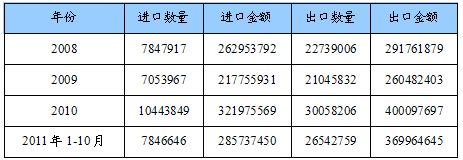 2008-2011年10月中国纸介质或塑料介质电容器进出口数量金额统计