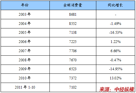 2003-2011年全球钢坯连铸机用结晶器需求量